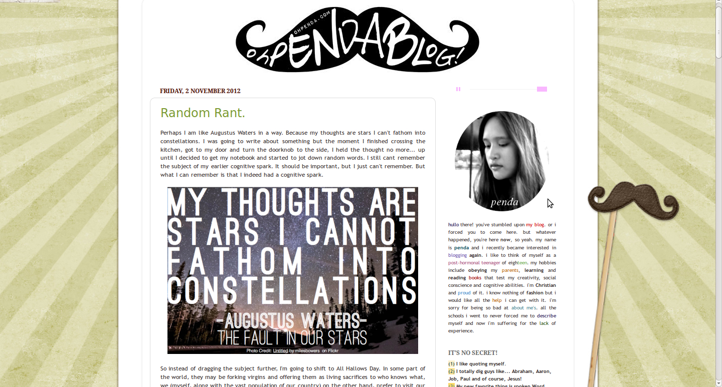 When I first started a blog, I had good intentions, so I guess that's what you need. Whether we do it for our readers, ourselves, or both, it's what we need to get a blog up and about and going. I started writing too and some people commended me of my writing style, which I thought was very weird. I've been blogging on Ohpenda.com since September 2012. I've also been trying to climb the social intricacies of the webosphere by creating for myself a Twitter, a Facebook page and even as far as a Linkedin page. I've only just Google Analytics-ed my blog and submitted it to various Search Engines for uhh.. maximum popularity? Anyway, I'm a self-learning, self-wounding blogger when it comes to these things. Google Search is my best friend and bloggers are friends of my best friend whom I like to acquaint myself with (or rather because I rely on them for making everything possible).