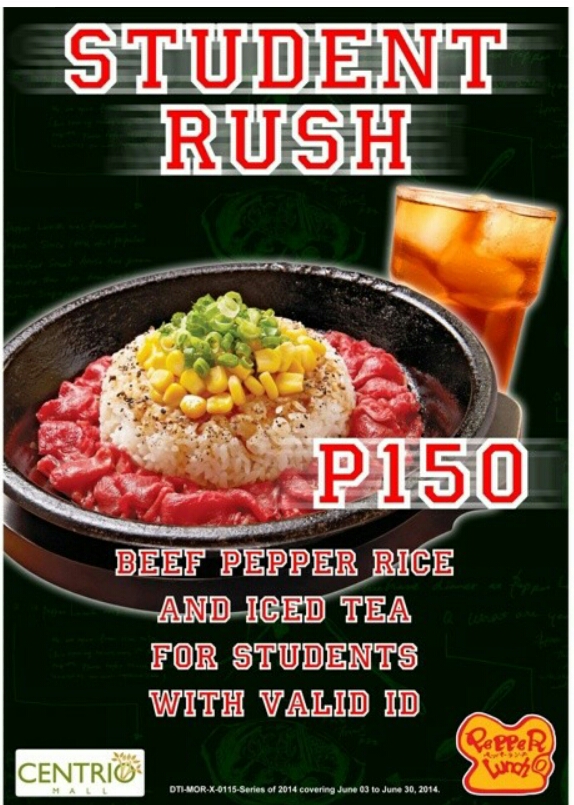 Student Rush 2 Promo - The student rush promo back in January is making a BETTER comeback. For only Php150, you get a Beef Pepper Rice Meal + Iced Tea! Just show your ID at the counter anytime, Mondays to Sundays. Hurry because this treat's only available this June! *available in Centrio branch only