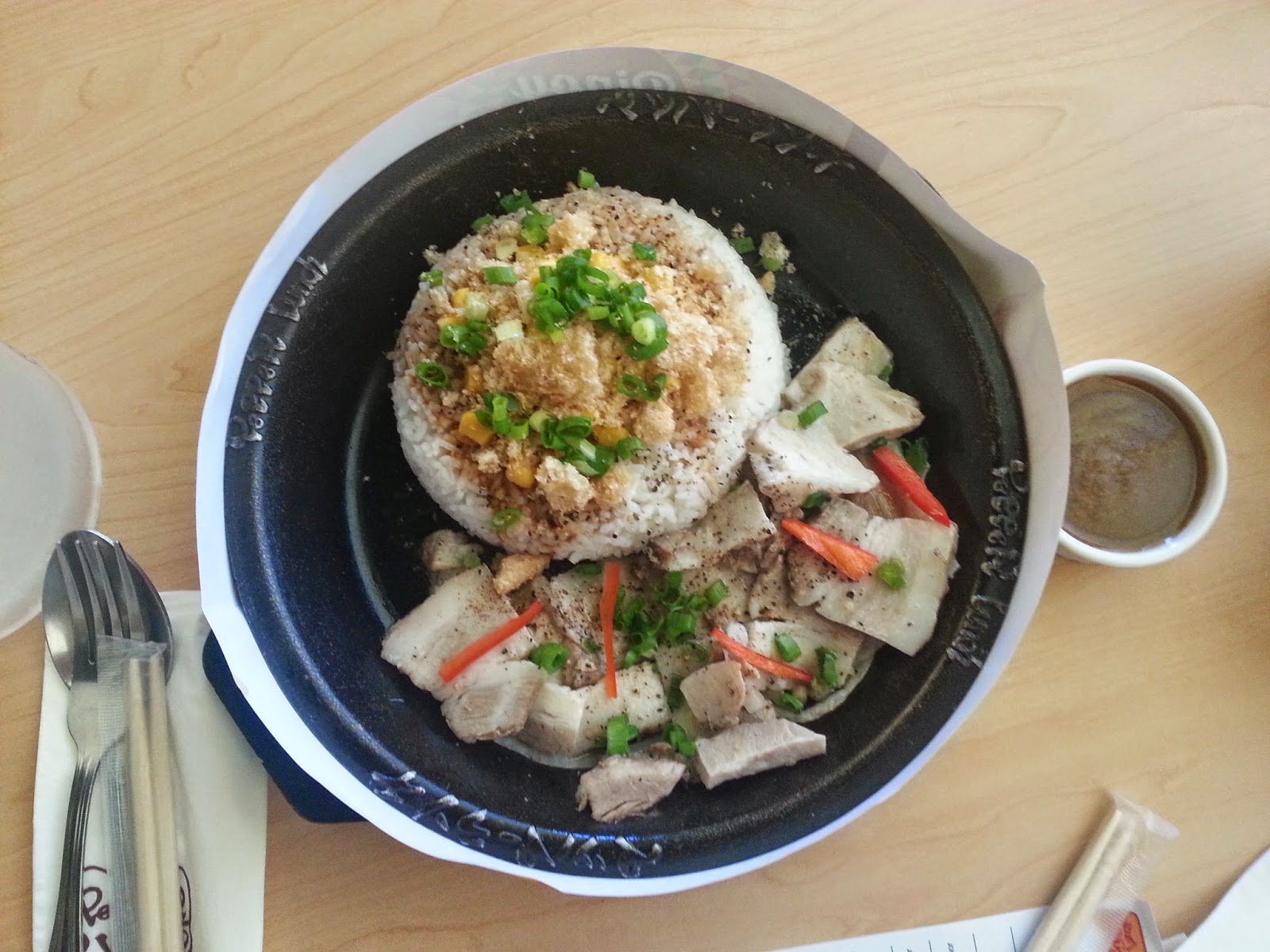 Japanese Pepper Rice surrounded by strips of pork sautéed like the fiesta favorite it's inspired by, Lechon (grilled pork). Available to dip in or to be mixed with the Pepper Rice is a Mang Tomas sauce that we Filipinos just cant get enough of. The rice was topped with chicaron to make up for lack of crispy pig skin that, for the information of my nonFilipino readers, is a crowd favorite during fiestas as well. There was a garlic flavor was strong enough to be noticed yet not too much that it became a nuisance.