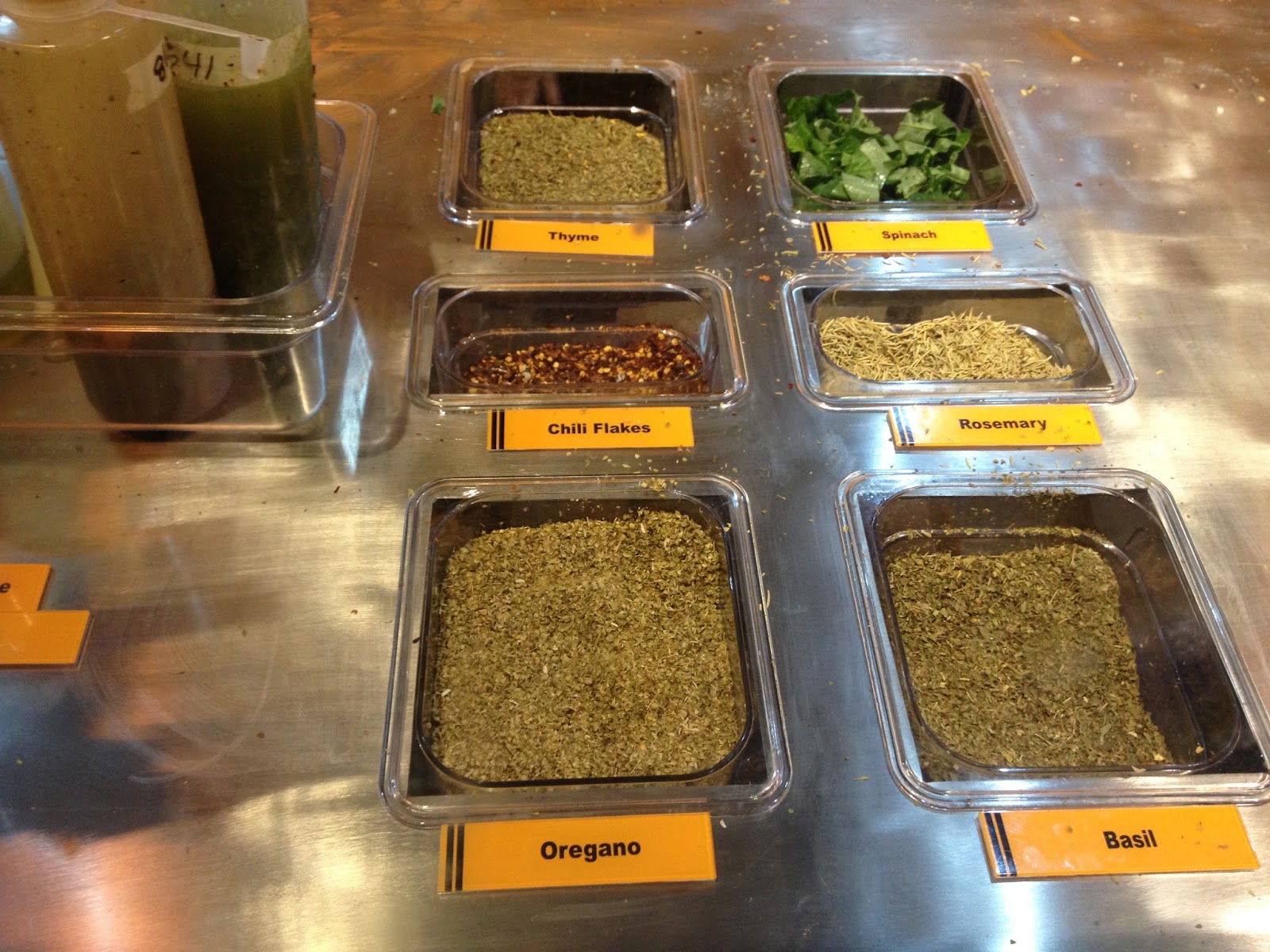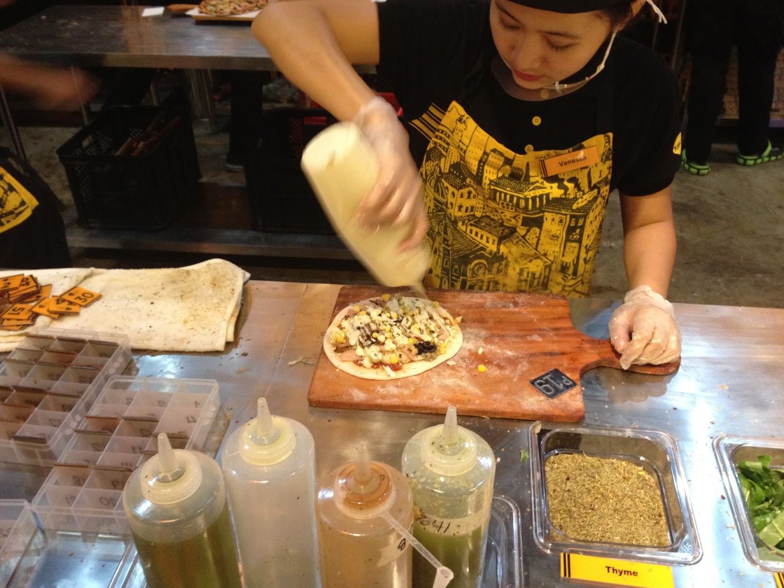 My regular pizza: I'm a big cheese fan so I went with a Quatro Formaggi pizza and worked from there-- Mozarella, Parmesan, Cheddar, and Cream cheese. When I'm feeling brave, I add Gorgonzola to the mix too. For meat choices, I'm hardly the traditional salami girl here but prefer frankfurter, bacon or ham spread out. Finally, what gives my pizza some flavor--herbs and spices. My choices are pretty standard (except for that time I tried corn), both green and black olives, onions (regular ones and caramelized ones), mushroom and tomatoes. Then I get them to add pinches of thyme, basil and oregano with a fraction of a pinch of rosemary. Add a squeeze of cheese and pesto sauce and voilĂ ! I'm a make-believe chef!