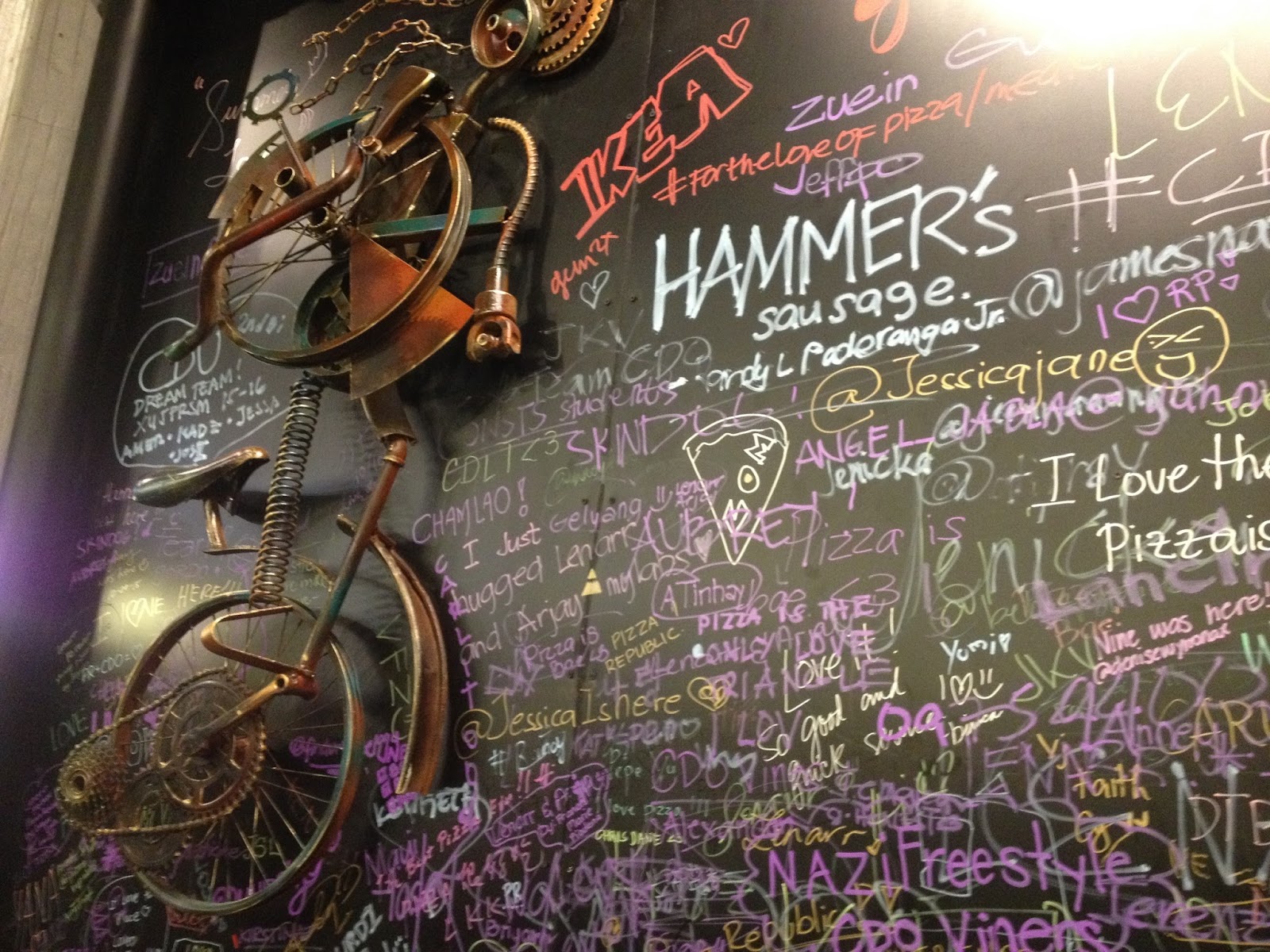 I went on opening day and it was pretty packed. They have this modern industrial thing going on. Based on what I've seen on the internet, it's similar to what they did in their Cebu branch. My thoughts on the building when I first saw it was, 'Ew! What on earth is that big slab of concrete sitting outside Ketkai?' After seeing the finished product, I still think it's ugly but fortunately, it's the inside that matters (or that's what my mom tells me). The interiors are pretty cool, more metal and steel and it would've been steampunk paradise. There's also this wall where you could sign your name or vandal, obviously people choose to do both.
