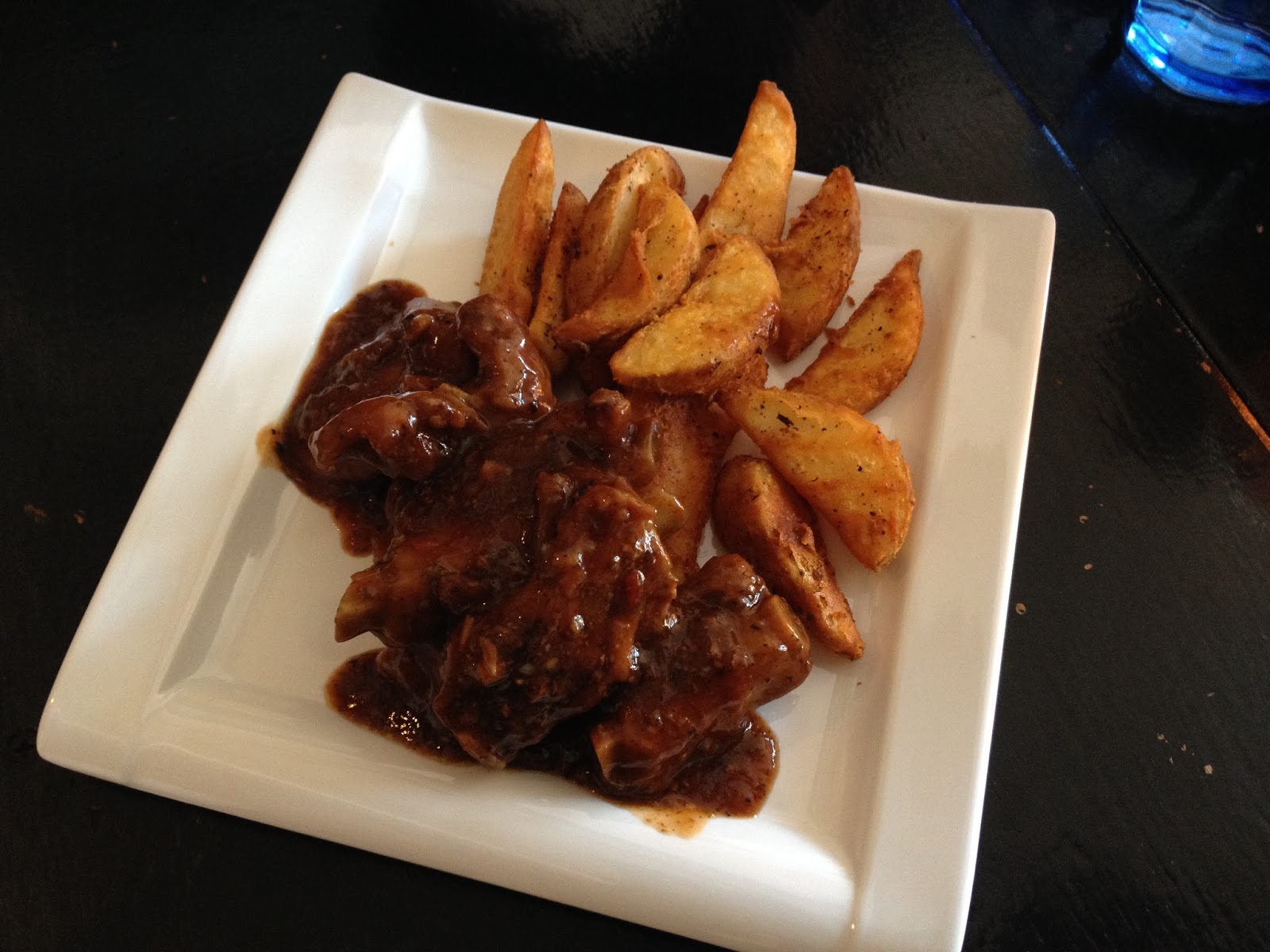 Beautifully cooked chicken soaked in BBQ sauce with a side of potato wedges. These wedges are similar to Shakeys mojos.